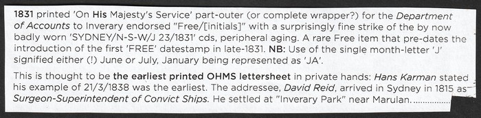 with 'SYDNEY J 23 1831' cds printed 'On His Majesty's Service' with 'Department of Accounts New South Wales' imprint at LL (rather aged), 'Free' m/s at left & red m/s signature. Believed to be the earliest printed OHMS lettersheet/wrapper in private