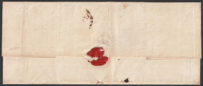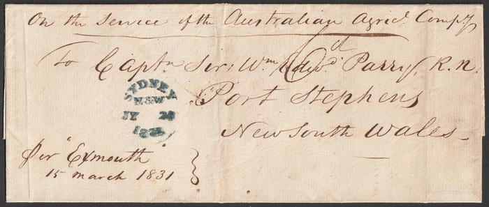 wrapper with 'SYDNEY NSW JY 24 1831' greenish-black arrival cds, endorsed 'Per Exmouth 15 Marginal, 1831, other inward postal markings, so apparently carried privately from England & posted in Sydney where rated '6d'. Rare early usage. (P) (Image1) (Image2)