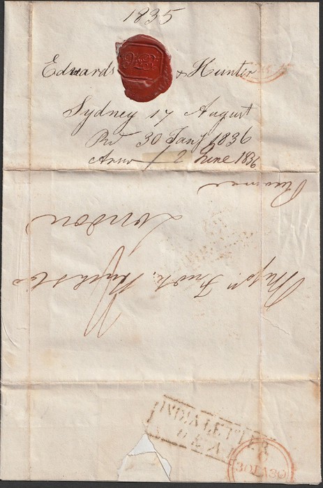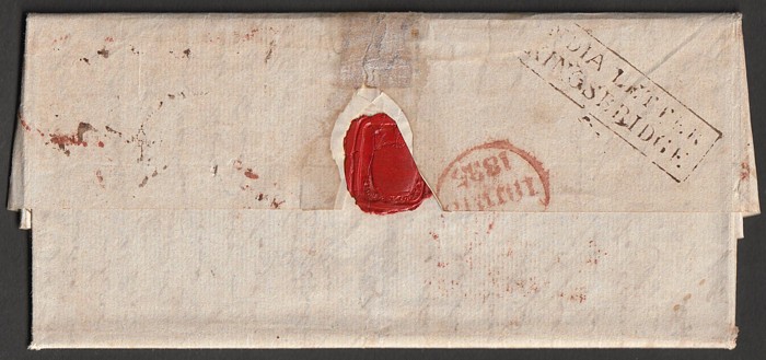 with indistinct 'POST PAID SHIP LETTER SYDNEY 5 FE 1835' crown oval red pmk. To GB with 'India Letter Kings bridge' boxed cachet. (Image1) (Image2)