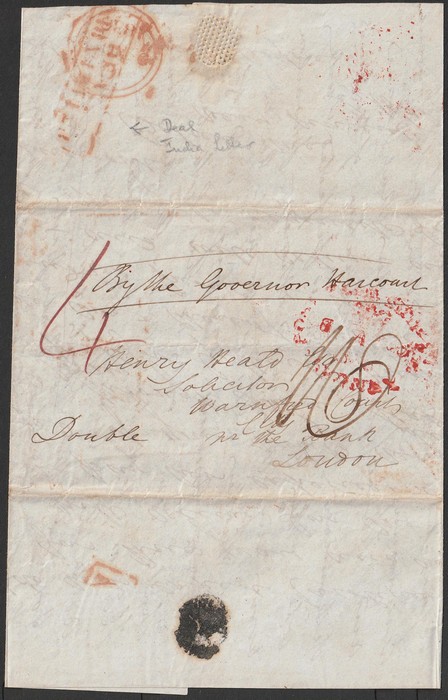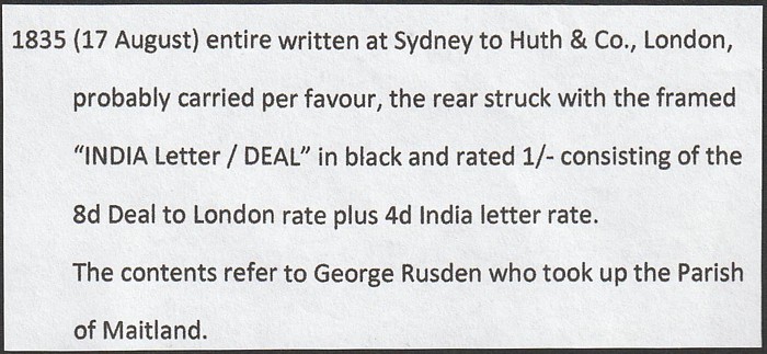 Letters with 1835 to London with 'INDIA LETTER DEAL' boxed cachet, other 1836 Sydney-London 'by The Governor Harcourt' with boxed 'Deal India Letter. (2). (Image1) (Image2)