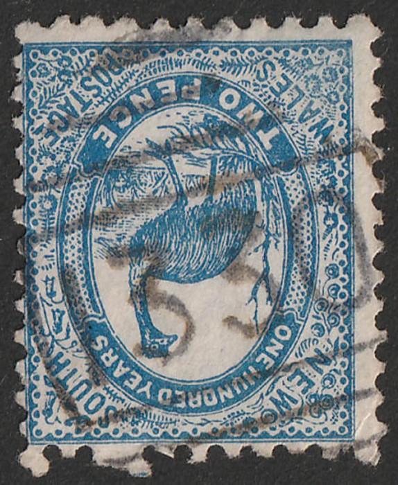 1330 of Bolong with straight top numeral 3 (RRRRR) light comp strike on 1888 2d Emu. Previously unrecorded, the illustrated example has round top numeral 3. (P) (Image1)