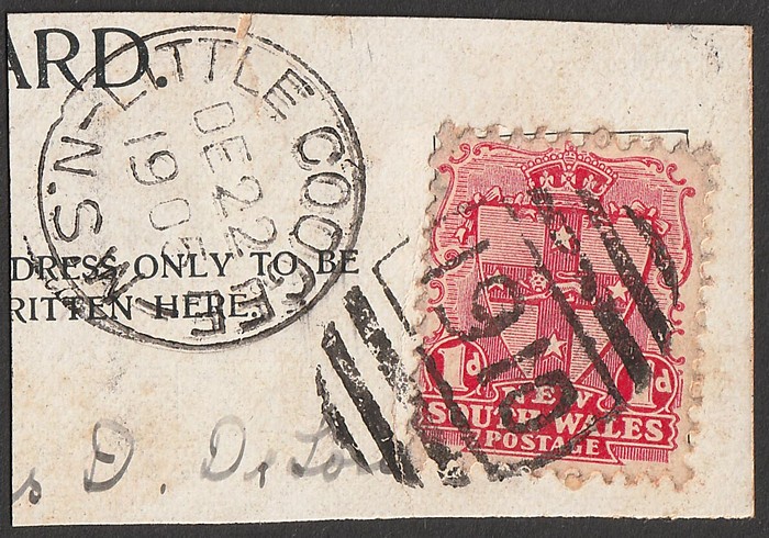 3420 imagePostmark: Numeral 1910 of Little Coogee (RRR, changed name to Clovelly 1914), bold strike on PPC fragment with 1905 cds at left. (P) (Image1)