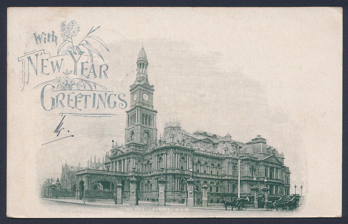 Numeral 1½d blue, view 'Town Hall' in black, 'New Year Greetings' in grey. VFU, to Germany, 'Sydney NO 29 98' duplex pmk 'Hamm' arrival cds. H&G 23B. (Image1) (Image2)
