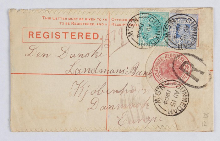 3479 imageRegistered Envelope: 1898 QV 3d size F curved flap on front, used to Denmark with QV ½d green & 2d tied by 'Gunnedah AU 15 1904' cds. H&G C12. (Image1) (Image2)