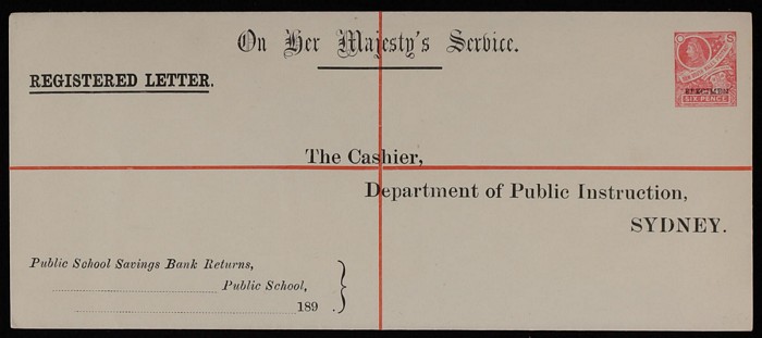 3484 imageRegistered Official Envelope: 1891 Centennial QV 6d red OS in die, cream stock, 58mm flap with seal, opt SPECIMEN. Superb fresh UN. (Image1) (Image2)