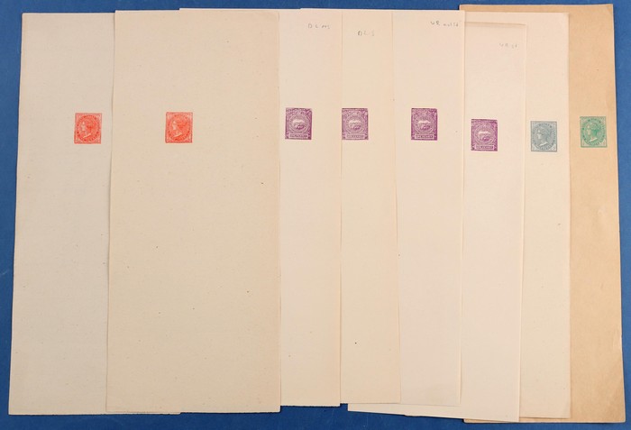 3489 imageWrappers: 1870s-1903 group with QV DLR 1d red with stamp at centre (2), 1888 Centennial 1d (4), QV ½d grey (2) & 1903 ½d green on thick dark buff stock. All with diff wmk positions or directions. VF fresh UN, unfolded. PSSA cat $155+. (9). (Image1)