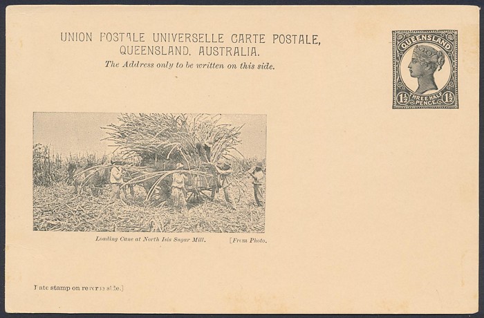 3561 imagePostcard: 1898 QV 1½d black view Loading Cane at North Isis Sugar Mill. Superb fresh UN. H&G 11. (P) (Image1)