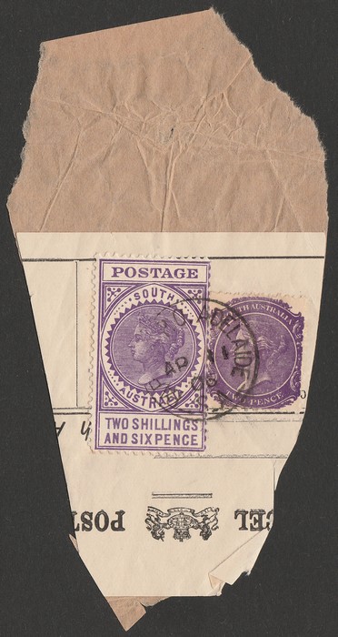 Postage 2/6, wmk crown A, on Parcel label piece with QV 2d violet. VFU, GPO Adelaide AP 11 06 cds. SG 295 & 304 cat £32+. ACSC S69 & S66 cat $46+ both as loose stamps & unpriced on cover, while earlier 2/6 is cat $1500. (P) (Image1)