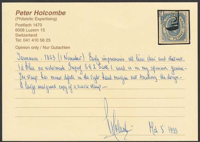 1d pale blue, early intermediate impression, lines clear & distinct on medium soft paper. VFU, tiny marginal tear at left, 4 margins & light cancel. Scott 1 cat US$1600. SG 1 cat £1500. 2024 Ceremuga AIEP photo cert. (P) (Image1)