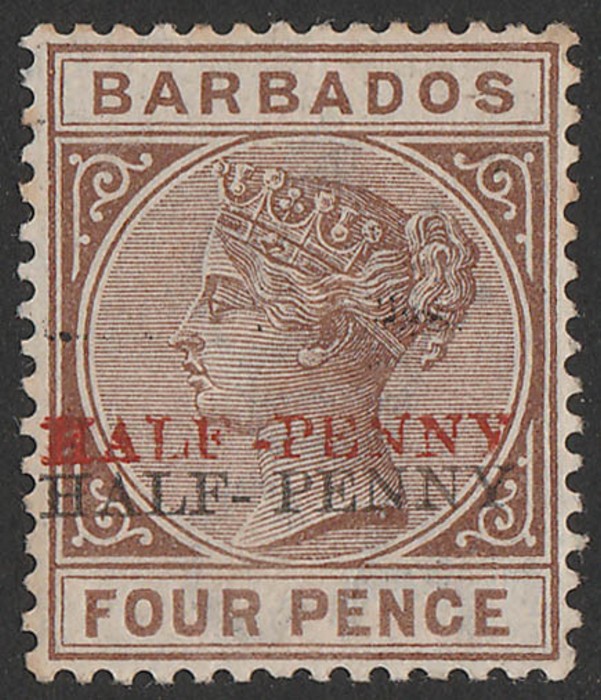 opt QV 4d brown opt DOUBLE in red & black. VF MLH. Scott 69c cat US$950, SG 104b cat £900. Opts believed to be an extremely well made forgery from the late 1890s. Interesting reference item. (P) (Image1)