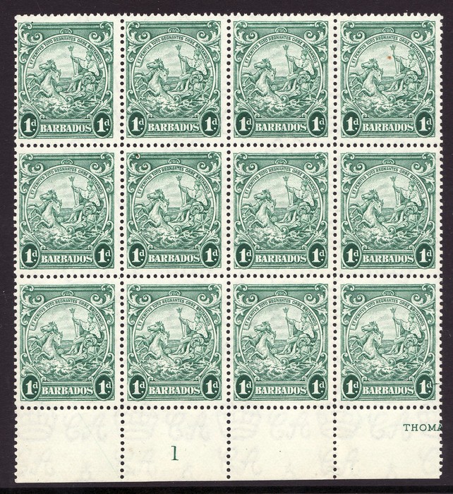 Seahorses 1d blue-green, bottom marginal blk of 12 with plate no 1 & part inscription, perf 13½x13. VF fresh MNH. SG 249b cat £60, plus premium for blk.