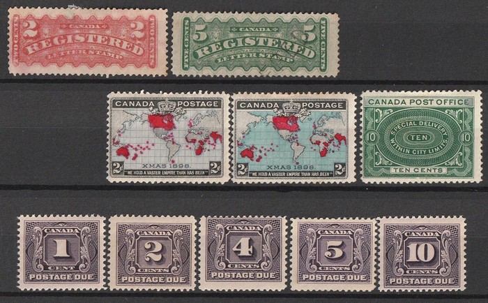 selection inc 1875-92 Registration 2c, plus 5c U. Special Delivery 1898-1920 10c green. 1898 Christmas 2c (2 diff shades). 1906-28 Postage Due 1c-10c. F-VF M/UN, 1 U. SG cat £333. (10) (Image1)