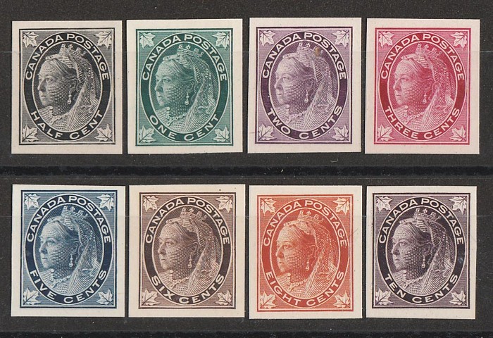 Leaves set ½c-10c, imperf proofs, on card. Superb UN as made, all 4 margins. SG 141-149(p) cat £450 as normal set, Unitrade 66P-73P cat C$2000. Attractive & rare set. (8) (P) (Image1)