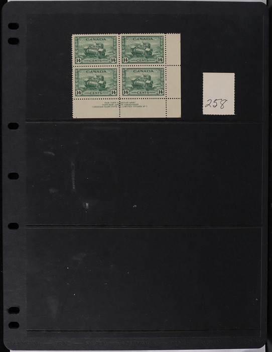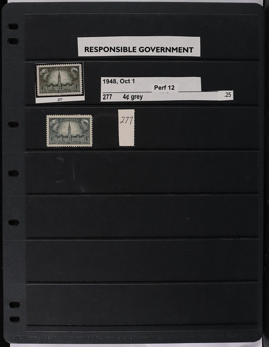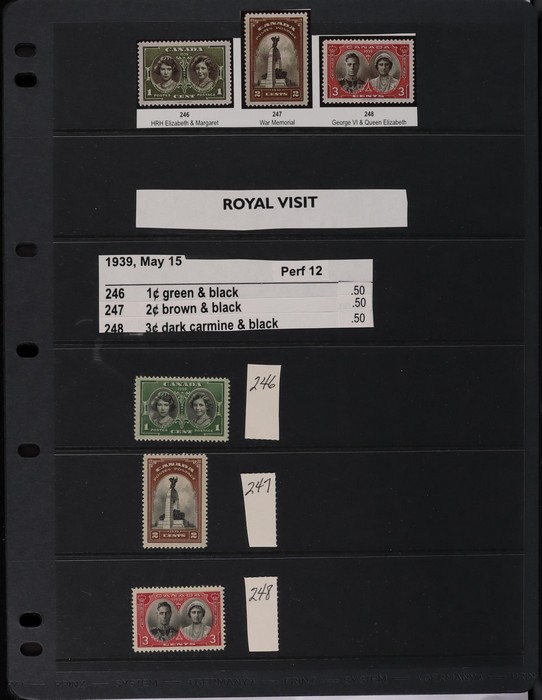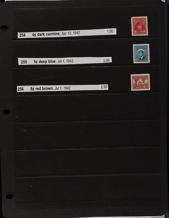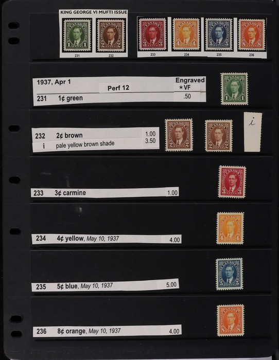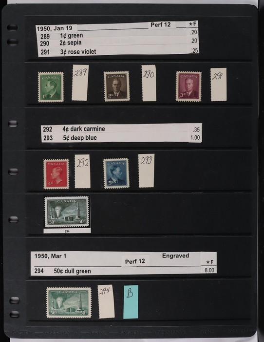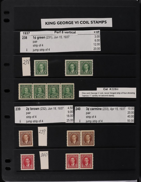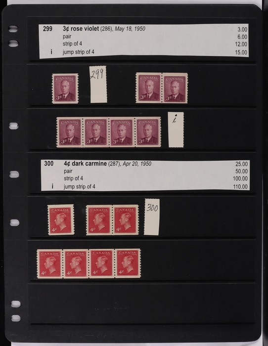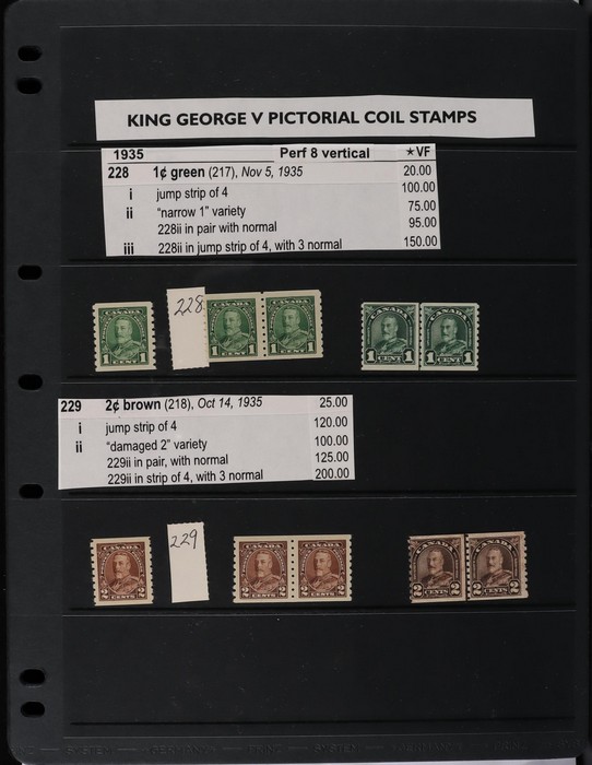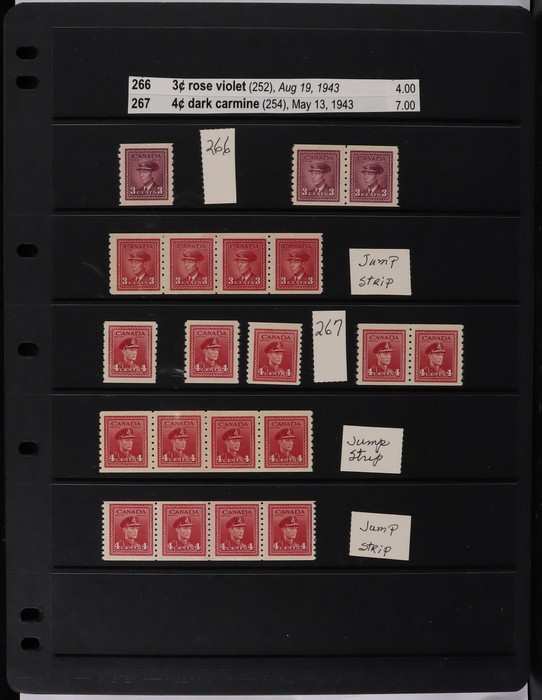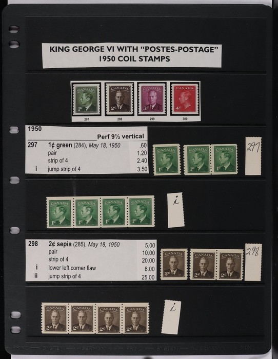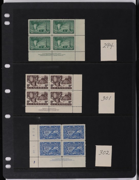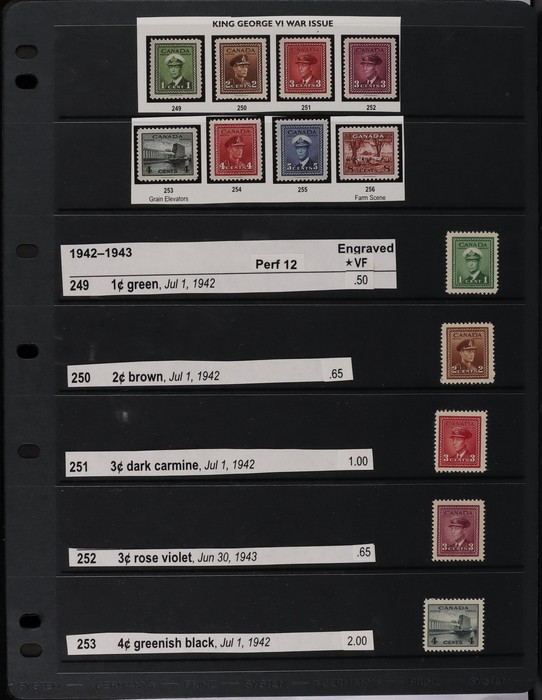 collection in binder inc 1935 KGV pic set to $1, plus coil prs. 1937 KGVI Pic set to $1, plus coil prs. 1942-43 War Effort set to $1, plus 14c imprint blk & coil prs. 1946 Peace set to $1, plus coil prs. 1951 Fishing $1. 1950 Oil Well 50c imprint