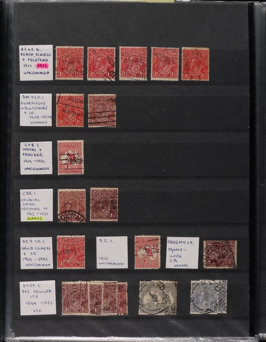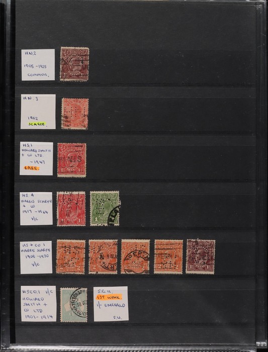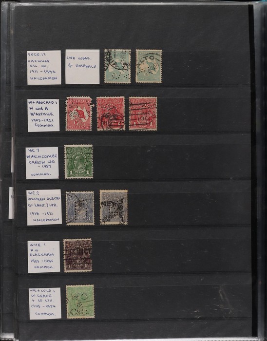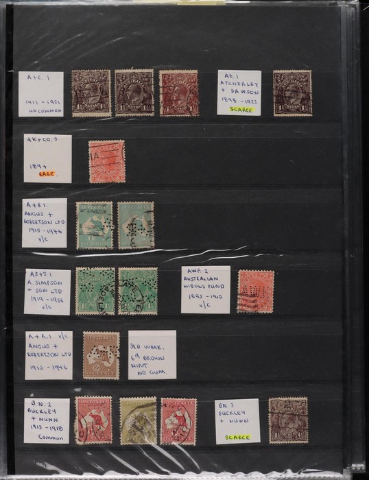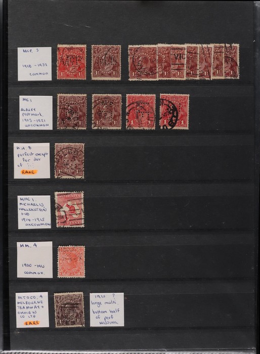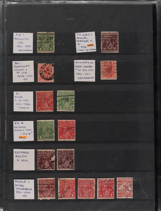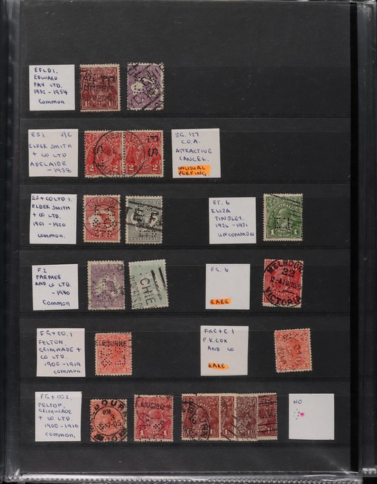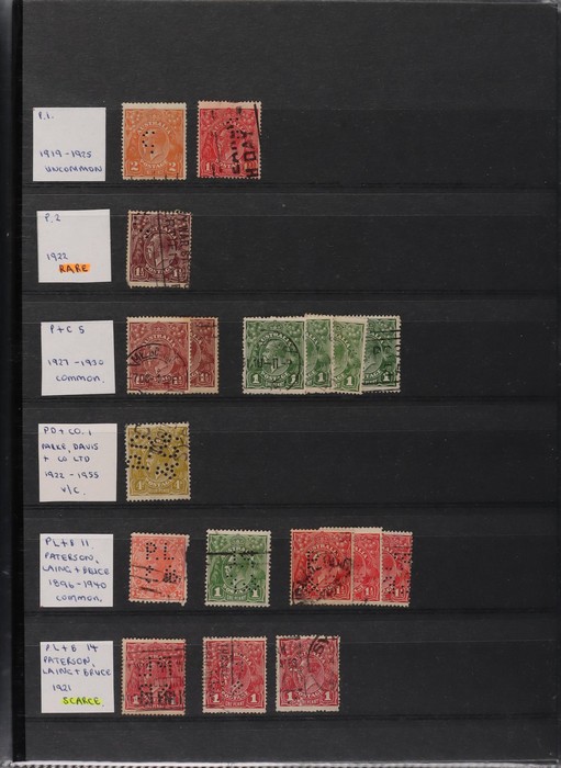 419 imageAustralian Perfins collection 1890-1930s in album with most identified by reference to Commercial Perfins of Australia, mainly on KGV to 4d lemon-yellow, some Kangaroos to 1/- & few Victoria QV. Ratings rare - 11, uncommon to scarce 20+, few varieties noted. Some pmks. G-VFU. Good collection for specialist. (350+) (Image1) (Image2) (Image3) (Image4) (Image5) (Image6) (Image7) (Image8) (Image9)
