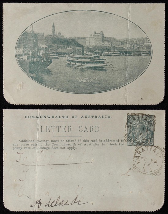 423 imagePostal Stationery - Lettercards: 1914-18 KGV 1d range Die I perf 12½ with Botanic Gardens Sydney, Circular Quay, Coal Cliff, Flinders St, Govt House Sydney, Mt Gould, Narracoorte Caves, Nth Terrace, Pall Mall, Perth Road (no sky), Piccadilly, Port Pirie, Public Blds Bendigo, River Derwent (close up), Tasman Peninsula, & Threshing Wheat. Mostly F-VFU. ACSC LC18 cat $980. Good starter lot for this interesting field. (16). (Image1) (Image2) (Image3) (Image4) (Image5) (Image6) (Image7) (Image8) (Image9) (Image10) (Image11) (Image12) (Image13) (Image14) (Image15) (Image16)