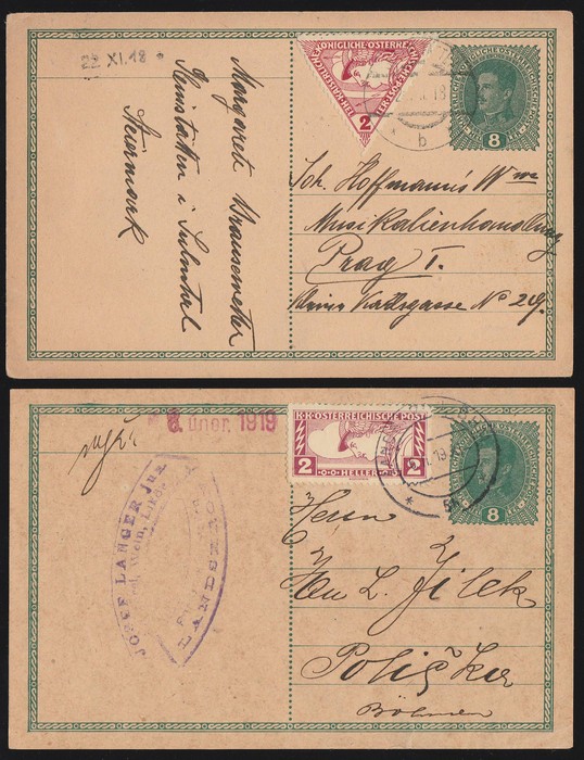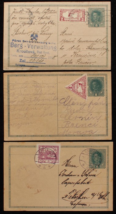 cards franked Austria Karl & Crown types inc 5h+20h (3), 10h+15h, 25h (2) & 30h. All diff designs of card & some bi-lingual pmks inc Smichov, Nezdashow, Mezirici, Malsice, Krombach, Trnowan, Obernitz, Bilin, Jechnitz, Braunow, Libechov & Ceska Cerma.