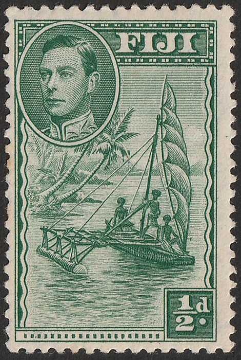 Sailing Canoe ½d green, variety 'extra palm frond'. VFM. SG 249ba cat £140. (Image1)