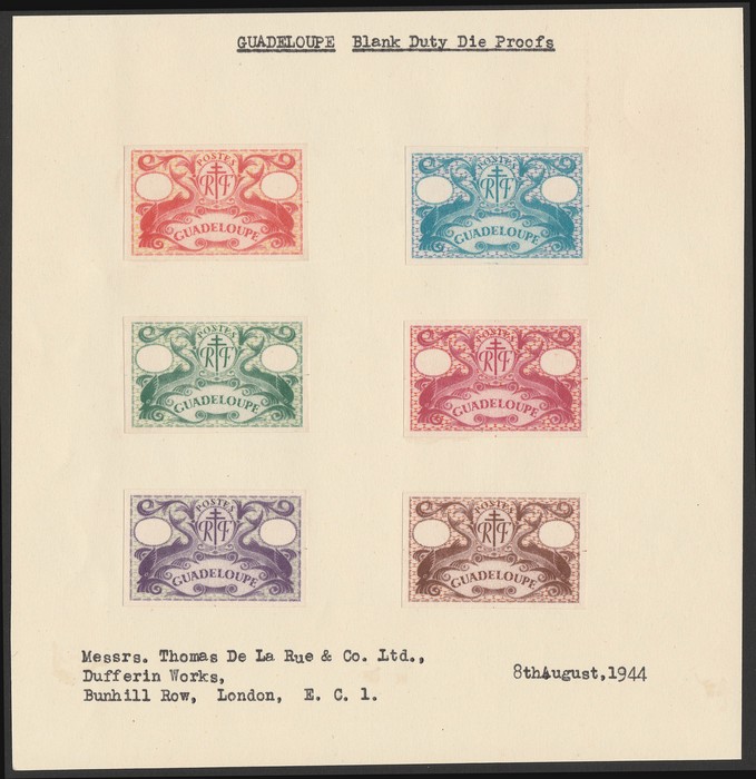 F Cross of Lorraine, imperf blank duty DIE PROOF set of 12 diff colour combinations with OMITTED value tablets. Superb M/UN as made, all affixed on 8 & 18 August 1944 pieces from Thomas De La Rue archive pgs, all 4 margins. SG 183-201(p). Yv