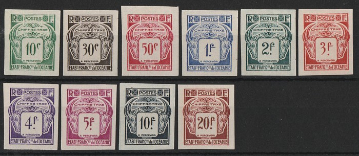 Settlements: 1948 Postage Due set 10c-20Fr, all IMPERF. VF fresh M, all 4 margins. SG D210-19(var). Yv TT18-27ND cat €150. (10) (P) (Image1)