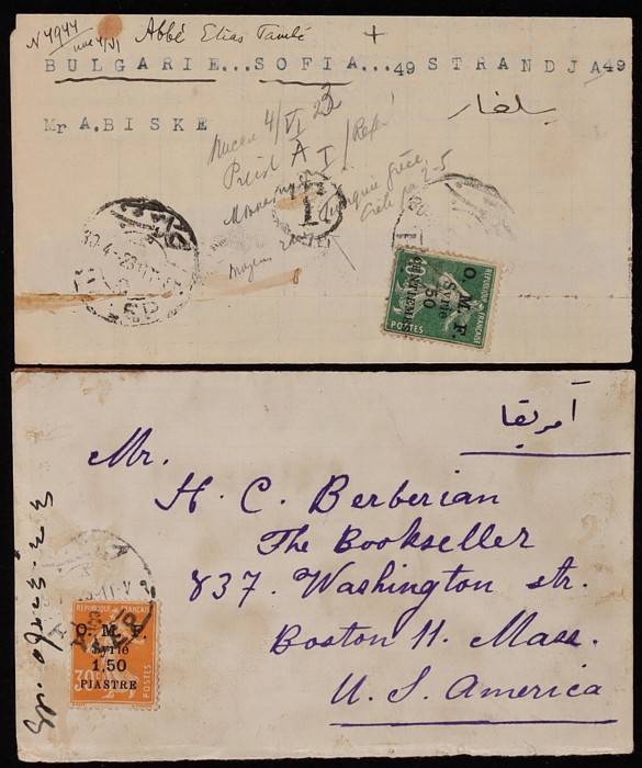 franked OMF Syrie 3Pi/60c Merson 3-line opt tied by 'Halep 12 4 22' cds, then 'OMF Syrie' 4-line opts with 50c/10c green on Lettersheet to Bulgaria with 'Halep 30 4 23' cds, 1.50Pi/30c orange card tied 'Halep 9 7 23' cds & 2.50Pi/25c blue cover & the