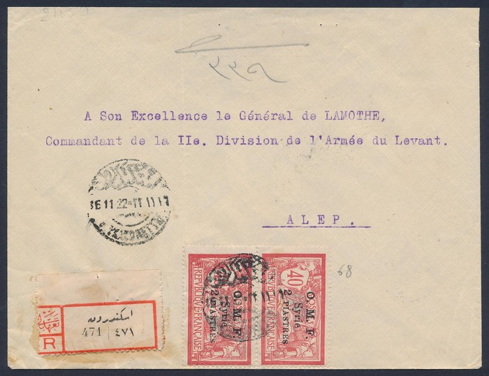Registered cover franked 'OMF Syrie' opt 2Pi/40c (2), tied by ' Alexandretta 16 11 22' cds. To Commander of 1st & 2nd Divisions of Levant Army, Aleppo. SG 73. Scarce usage from Hatay. (Image1)