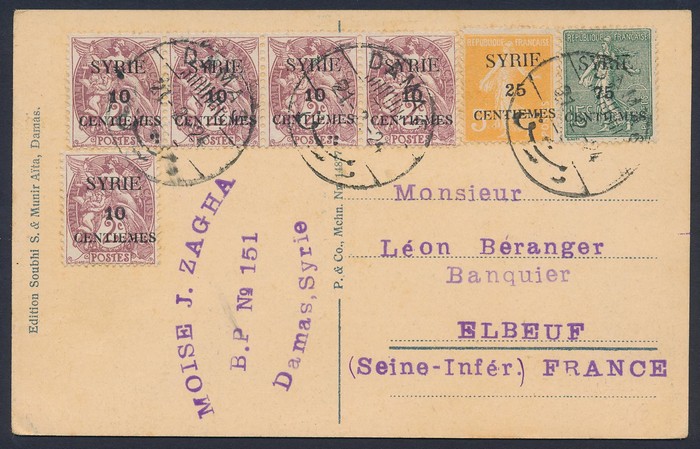 franked 1925 Bridge 3Pi tied by 'Damas 18 AP 30' cds. SG 184. Interesting use of old Ottoman period PPC. (Image1) (Image2)