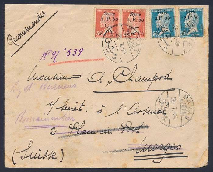 Registered cover franked 'OMF Syria' opts 25c/5c, 75c/15c & 1Fr50/30c tied by green 'Damas' cds. To France with Nancy arrival b/s. SG 71, 95, 96b & 96c. (Image1) (Image2)