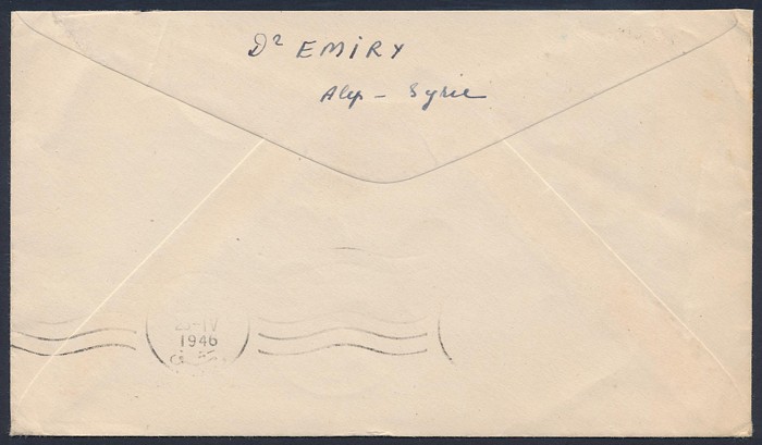 franked opt Fiscals 25Pi brown & 5Pi blue, tied by 'Alep 2 6 46' cds. To Paris. SG 410 & T422 cat £46. Yv 284 & 295 cat €83 - both as loose stamps alone.