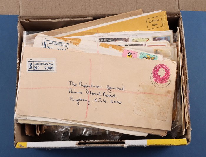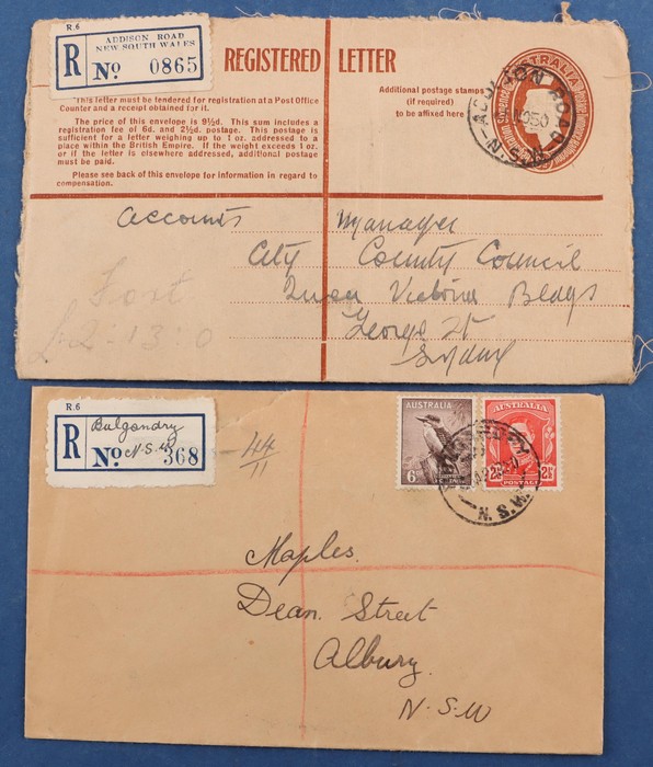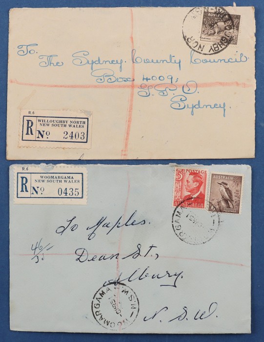 466 imageCovers - New South Wales Registered Mail 1950-70 group mainly with blue labels organised by PO Addison Rd to Young, apparently all diff labels, noted Bulgandry, Coogee North, Gol Gol, Macdonaldtown, Maroubra Bay, Millers Point, Rose Bay East, Rufus River, Tooleybuc, Warialda, Willoughby North, Woomargama & Yarra Bay, variable condition, a small number are fronts only. (380) (Image1) (Image2) (Image3) (Image4) (Image5) (Image6) (Image7)