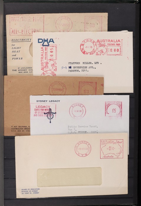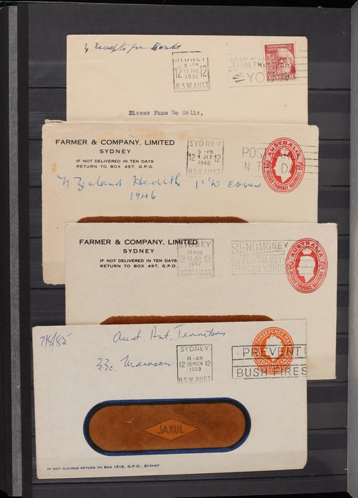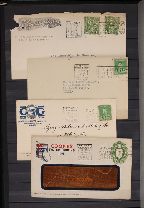 467 imageCovers - New South Wales: Sydney GPO collection to 1965 with numbered cds (75) to 156 inc 1 (4) on 1937 KGVI 1d, 2d FDC, 29 on Sesqui FDC, 32 (4) inc 1929 Airmail to Whitton & 1937 Sesqui FDC (3). Then numbers 108-156 on 1950s-60s Philatelic Mail mostly FFC & FDC. The Departmental cds (30) mainly Airmail, Late Fee or Registered. Machine cancels (130) to early 1960s inc 1920-25 generic on KGV PTPO envelopes. 1930s-40s Posted in Circular Box, City Box, Country Box, Overseas Box, Pillar Box or Suburban Box (27). Numbered Slogan Cancels from 1-18 nearly Commercial issues with a variety of numeric styles. Also Paid Slogan Cancels (13) & a selection of Sydney based. Meter Mail. Mostly F-VF condition. A challenging subject, worthy of expansion! (270) (Image1) (Image2) (Image3) (Image4) (Image5) (Image6) (Image7) (Image8) (Image9) (Image10) (Image11) (Image12) (Image13) (Image14) (Image15) (Image16) (Image17) (Image18) (Image19) (Image20) (Image21) (Image22) (Image23) (Image24) (Image25) (Image26) (Image27) (Image28) (Image29) (Image30)