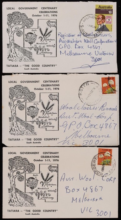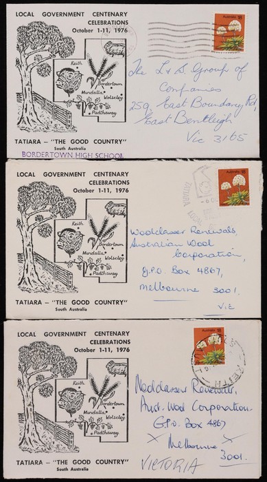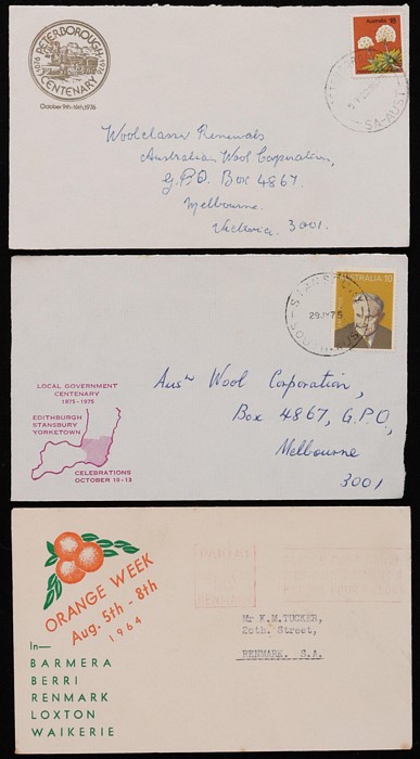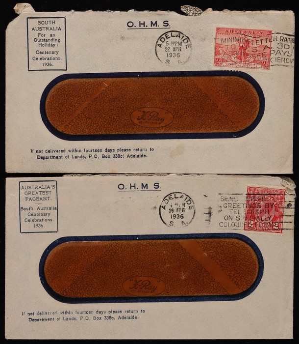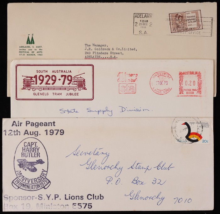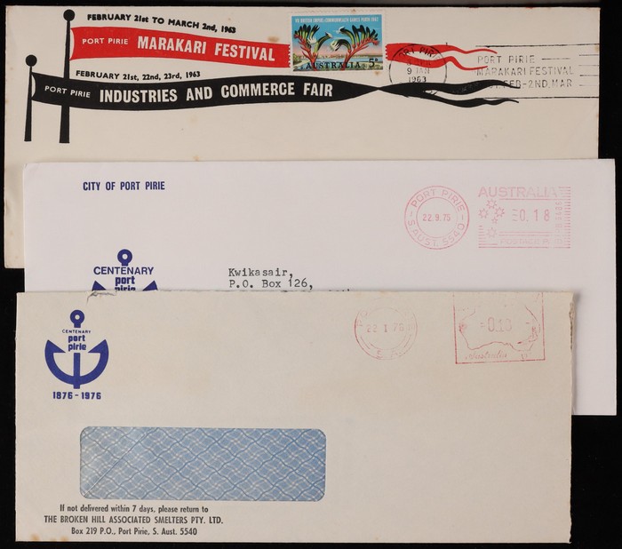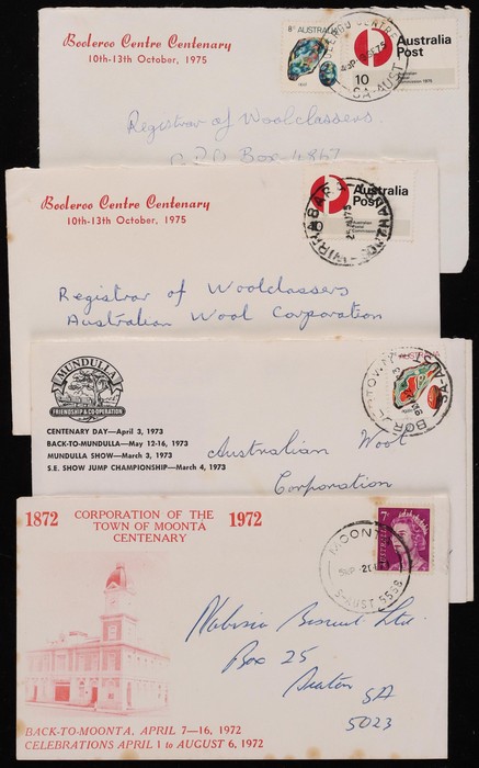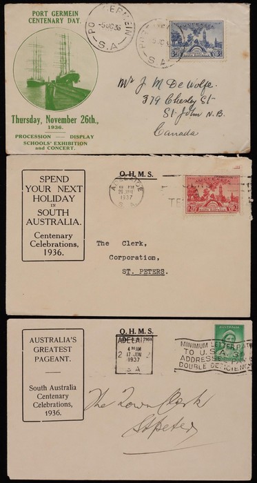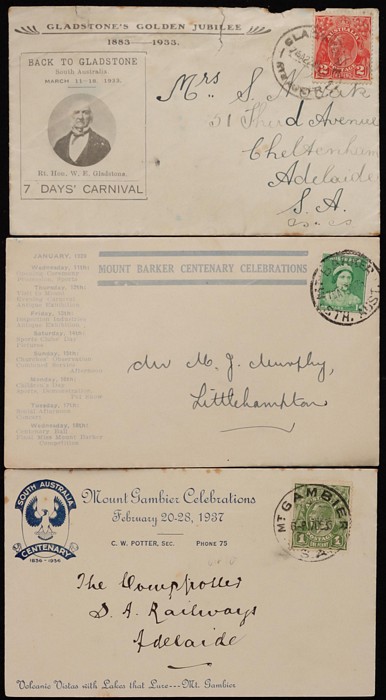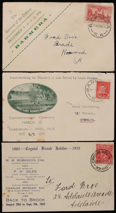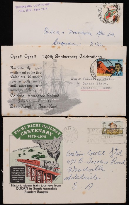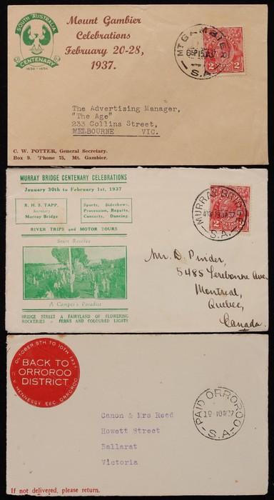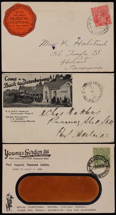 474 imageSouth Australia 1933-79 covers: Commemorative, Festival, 'Back To', Advertising. Lovely lot of 1930s inc Bermera (2), Crystal Brook, Gladstone, Mt Barker, Mt Gambier, Murray Bridge, Orroroo (front), Peterborough (2), Port Augusta & Port Germein, other 1960s-70s, plus 1936-37 SA Cent OHMS covers (4), a few tones. (36, 3 fronts) (Image1) (Image2) (Image3) (Image4) (Image5) (Image6) (Image7) (Image8) (Image9) (Image10) (Image11) (Image12) (Image13)