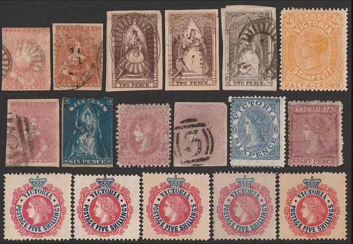 476 imageVictoria: 1850-1912 collection inc 1850-57 QV Halflength 1d (4) & 3d (3). 1852-55 Queen on Throne 2d selection inc shades & printings. 1858-63 QV Emblems range inc imperfs, roulettes & perfs. 1860-66 QV Beaded oval vals to 6d inc 4d imperf. 1863-73 QV Laureate vals to 5/- inc wmks, perfs & shades plus 2d, 6d (4 inc shades) & 8d M. 1885 Stamp Duty opt vals to 2/-. 1909-12 QV Postage vals to 5/- inc wmks & perfs. 1903-08 OS perf vals to 5/-. Most G-VF M/U, some mixed. SG cat £2700+ = A$5400+. (465) (P) (Image1)