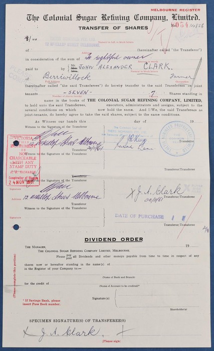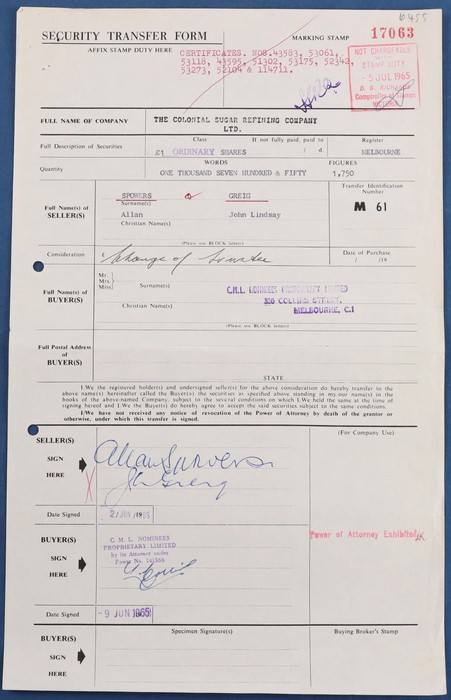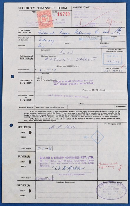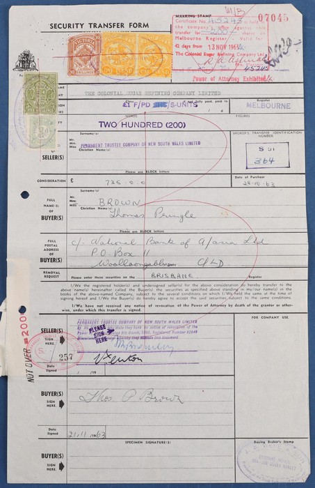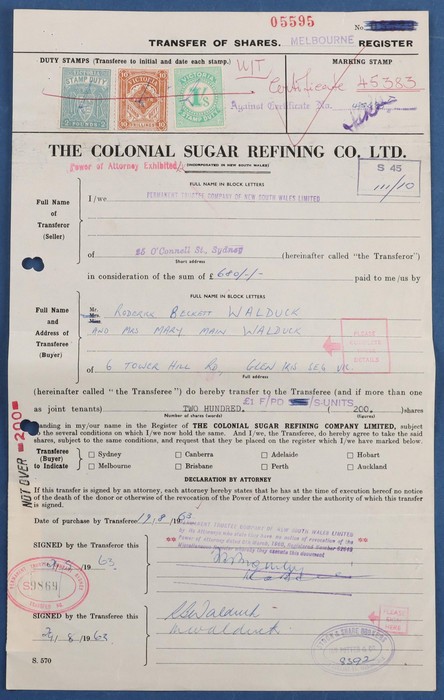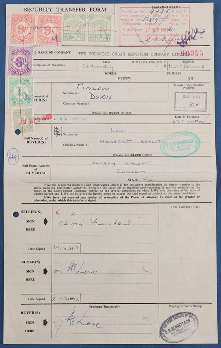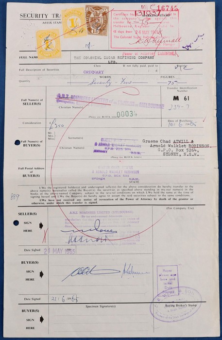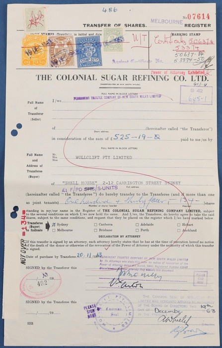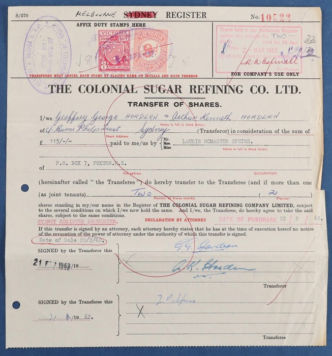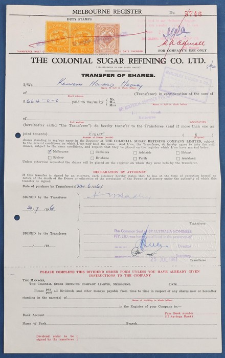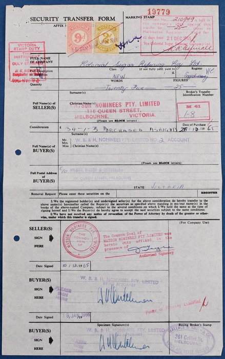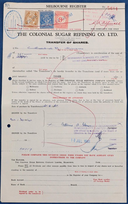 478 imageVictoria - Revenues: 1960s Colonial Sugar Refinery Co share transfer certificates with a range of vals from 9d pink single franking to £2 blue inc multiple frankings of up to 5 stamps. Approx 200 certificates inc a few with decimals attached or with 'Not Chargeable with Stamp Duty' cachets. (Image1) (Image2) (Image3) (Image4) (Image5) (Image6) (Image7) (Image8) (Image9) (Image10) (Image11) (Image12) (Image13) (Image14) (Image15) (Image16) (Image17) (Image18) (Image19)
