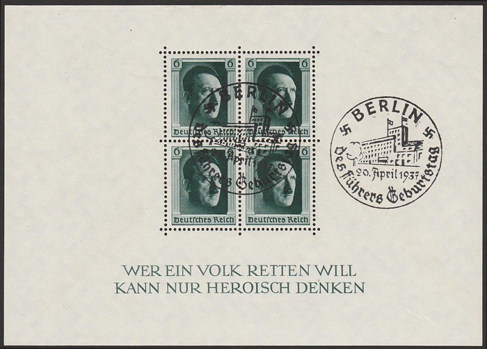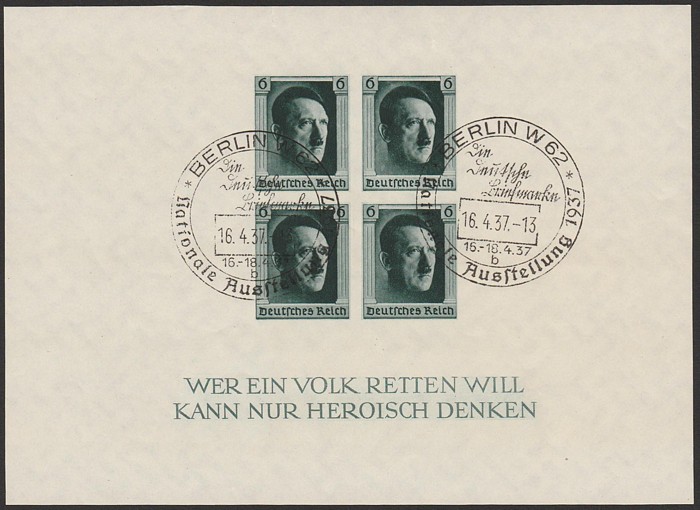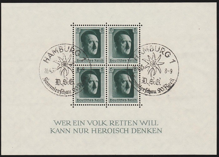 M/Sheet. Superb U, with 'Konigsberg Ostropa 1935 30.6.35 Schiffspos Grosses Moos Bruch' special pictorial shipmail pmk. Scott B68 cat US$825, Mi Blk 3 cat €900++, SG MS576a cat £1400++, plus premium for rare pmk & unusually nice condition.