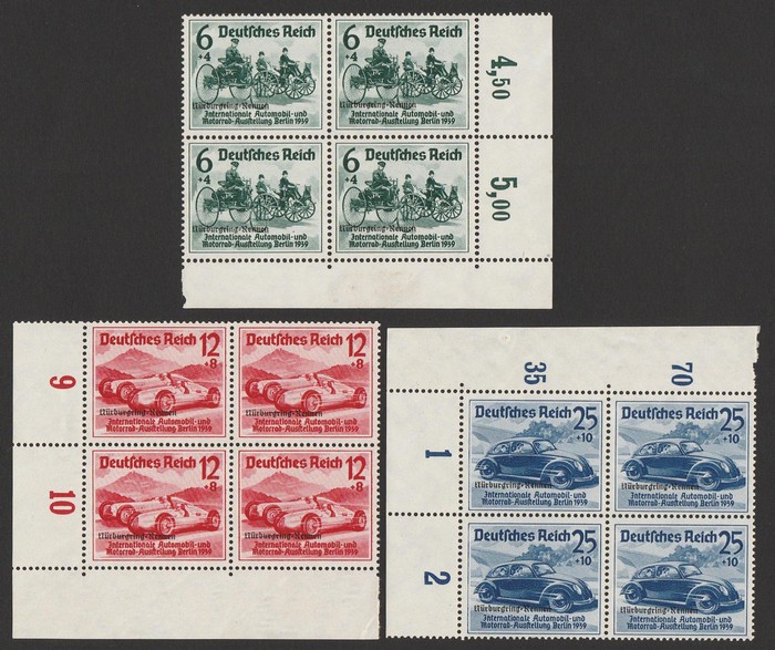 opt set 6pf-25pf cnr marg blks of 4. Superb fresh MNH. SG 683-85 cat £1300+. Mi 695-97 cat €1120+ both for singles, plus premium for blks. (3 blks) (P)