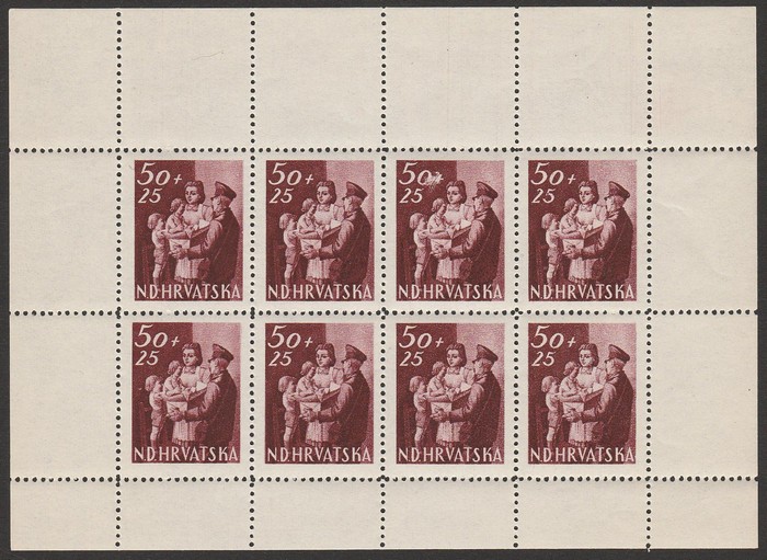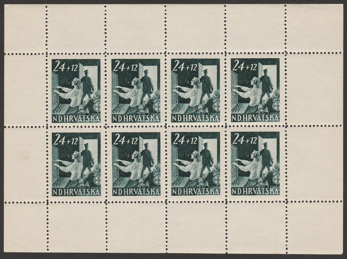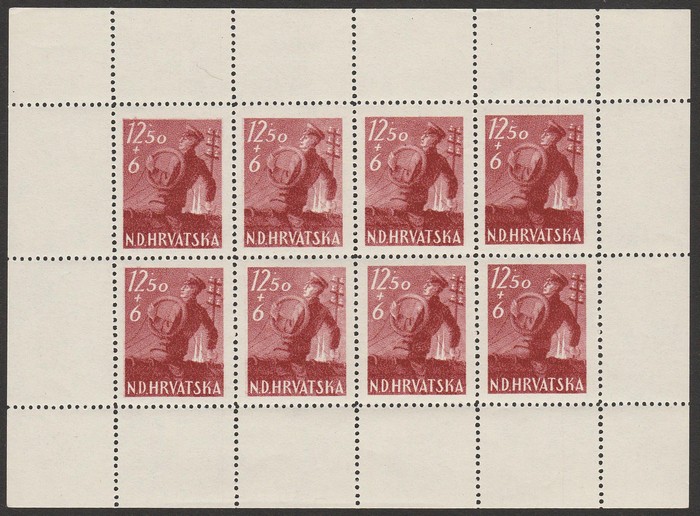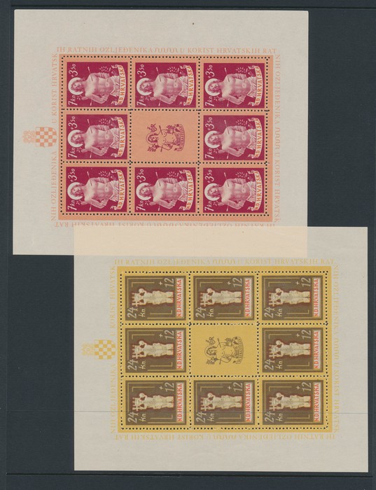 Zagreb Anniv 3.50K sheetlet of 8, 1944 Post & Rail Employees Relief set 7+3.50 - 32+165 sheetlets of 9, War Invalid Relief set 7-3.50K - 32+16K sheetlets of 8, plus central label. VF fresh MNH. Mi 97KLB & 150-57KLB cat €140. SG77 & 123-30 cat