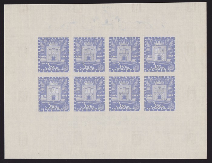 Zagreb Anniv 3.50K imperf PROOF sheetlet of 8 of stamp background & security underprint design, plus another proof sheetlet just of the security underprint design. VF UN as made. SG 77(p), Mi 97(p) cat €1200+. (P) (Image1) (Image2)