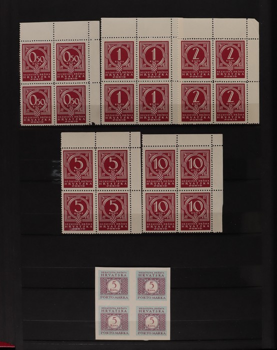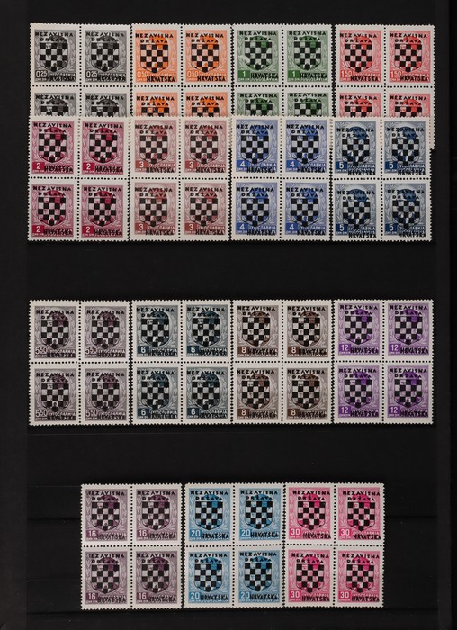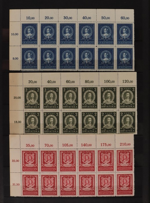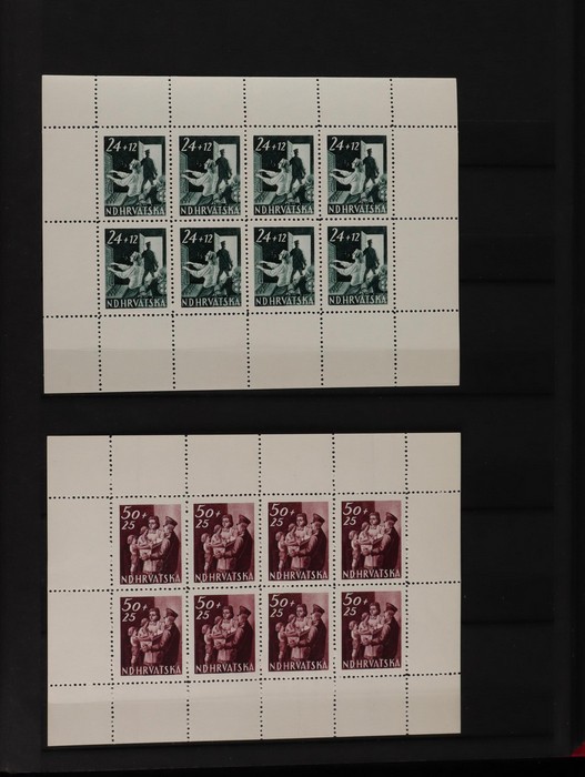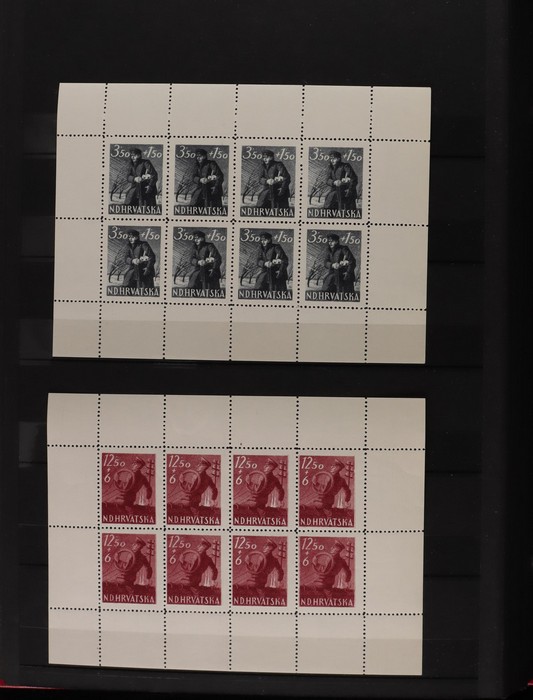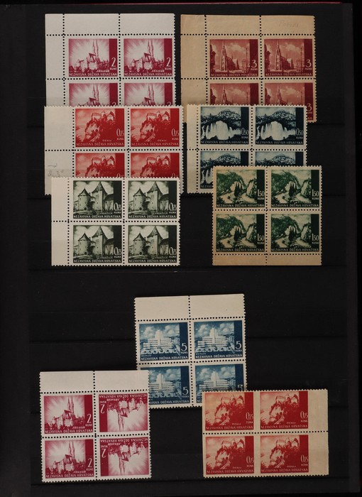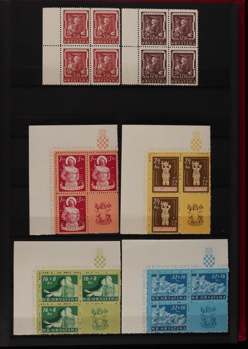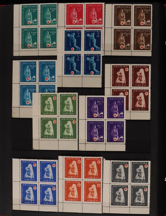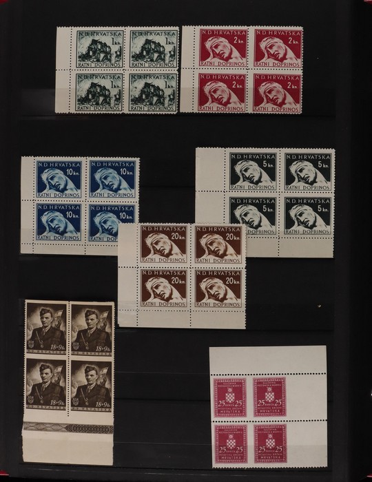 Fund set cnr marginal bks of 4 with part inscriptions. 1941 Red Cross set blks of 4 10k variety '11' for 'H'. 1942 Youth Fund set in 'centre cross' gutter blks of 16. 1943 Zagreb 700th Anniv sheetlet. 1943 Exhib 15k blk of 4. 1943-44 President set to