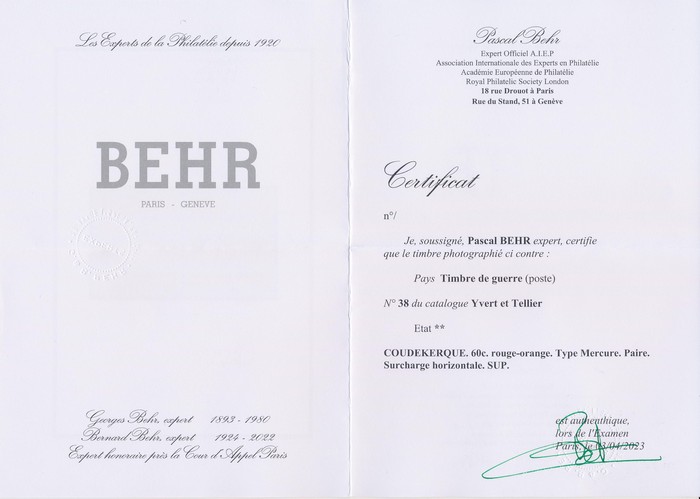 Coudekerque Provisional 'Besetztes Gebiet Nord- Frankreich' boxed h/s opt type II on Mercury 60c orange-red, horiz pr. Superb fresh MNH. Maury 38, Mi 15II(var) basic stamp previously unrecorded in Mi with type II opt & cat €2500 per footnote for