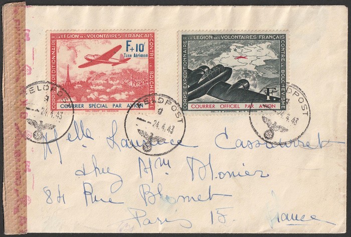 1941 French Legion on Eastern Front Airmail set F (+10F) black & red & F+10 red & blue. On cover tied by 'Feldpost g 24 4 43' cds. To Paris with Censor type. Mi II & III. Maury 2-3 cat €600. Attractive & rare usage. (P) (Image1) (Image2)