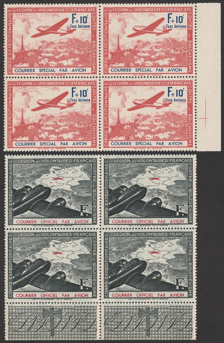 1941 French Legion on Eastern Front set Airmail F(+10F) green & red, & F+10 red & blue both blks of 4, last with variety 'missing accent on Aerienne' (pos 15) & variety 'N of AVION short at right (pos 10). VF fresh MNH. Maury 2-3(var). Mi II-III inc