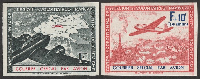 1942 French Legion on Eastern Front set Airmail F (+10F) green & red, & F+10 red & blue with OSTFRONT opts shifted, 1st up & right, 2nd up & left. VF fresh MNH. Maury 4g & 5g cat €220. Mi IV(var) - V(var) cat €800++ as normals, plus premium