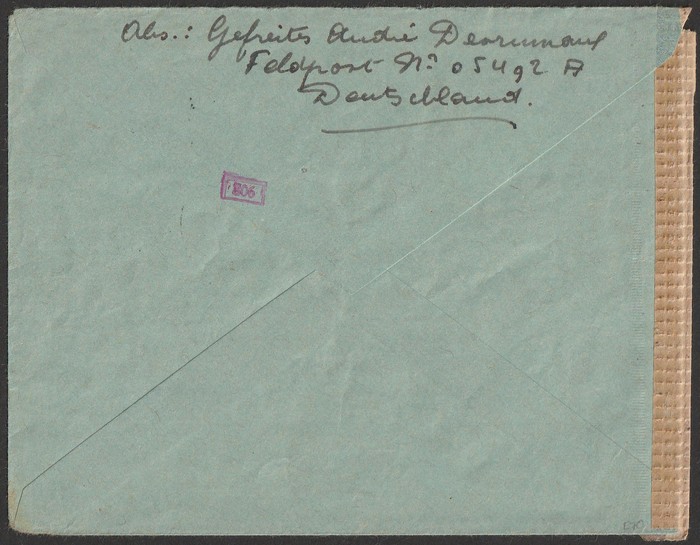 French Legion on the Eastern Front battle scene F-1F green & purple charity stamp with pictorial tab with 'Artillery' design of soldiers firing, tied to Fieldpost cover by 'Feldpost d 06 3 44' cds, Dienstelle F.P. Nr 05492B' cachet & censor h/s at