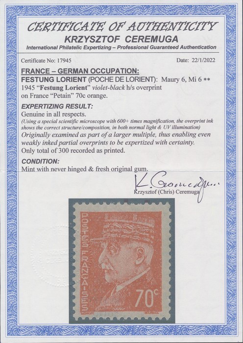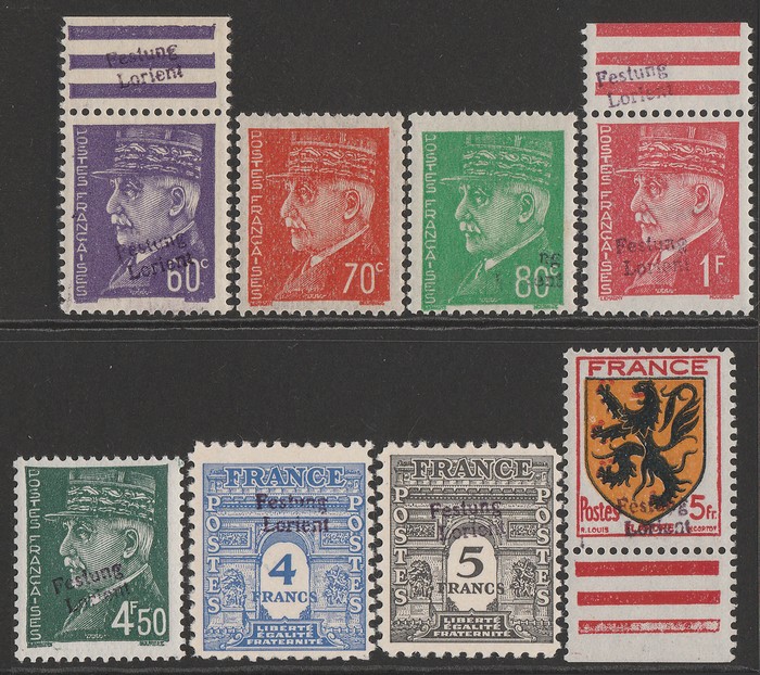 Atlantic Pocket 'Festung Lorient' h/s opts on Mercury 10c-50c, Petain 60c-4.50Fr, Arc de Triumph 4Fr & 5Fr, plus Arms 5Fr, with 5 stamps genuine opts (with certificates), & 11 stamps forged opts (expertised as such). VF fresh MNH. Mi 1-15 would cat