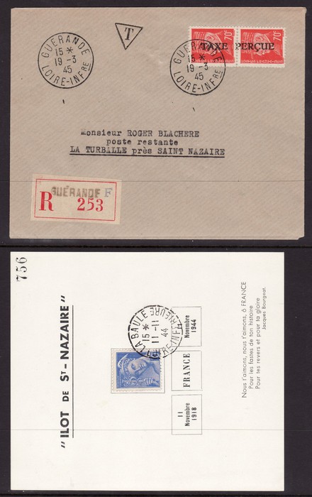 registered cover for 1st day of provisional use of meter franking due to shortage of stamps with 'La Baule 8 1 45' cds (Mayer cat €420). Also registered cover franked Petain 70c pr opt 'Taxe Percue' & tied by 'Guerande 19 3 45' cds & taxed for