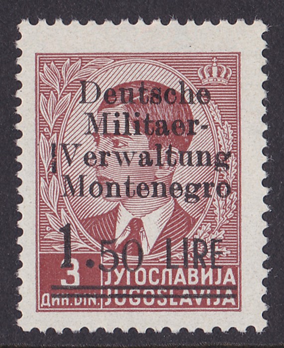 'Deutsche Militar-Verwaltung Montenegro' opt Yugoslav set 0.50L/3D - 20L/4D, tied to 4-line opt Postal Card 1L/4D by 'Bernan 19.XI.43 cds. SG 76-84 cat £1400+ as loose stamps alone. Mi 1-9 cat €580 for CTO stamps with this cancel or