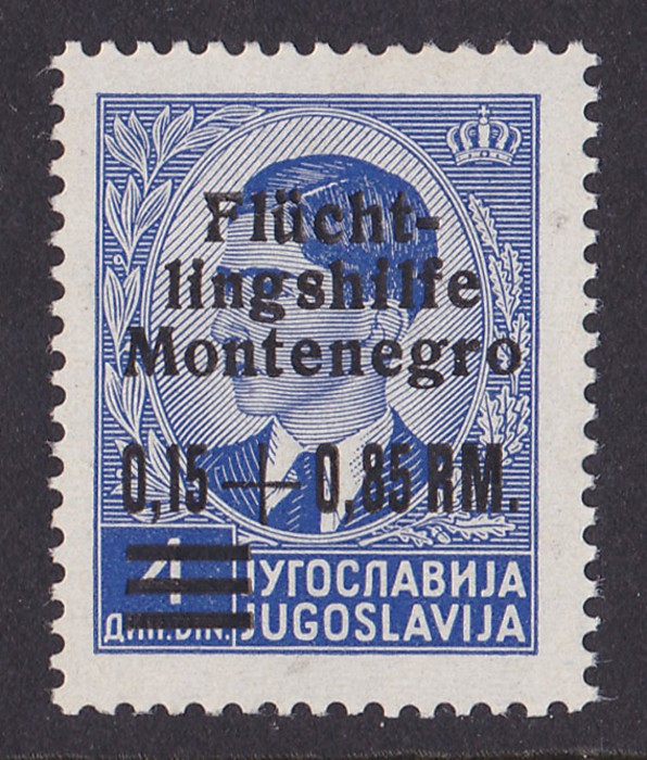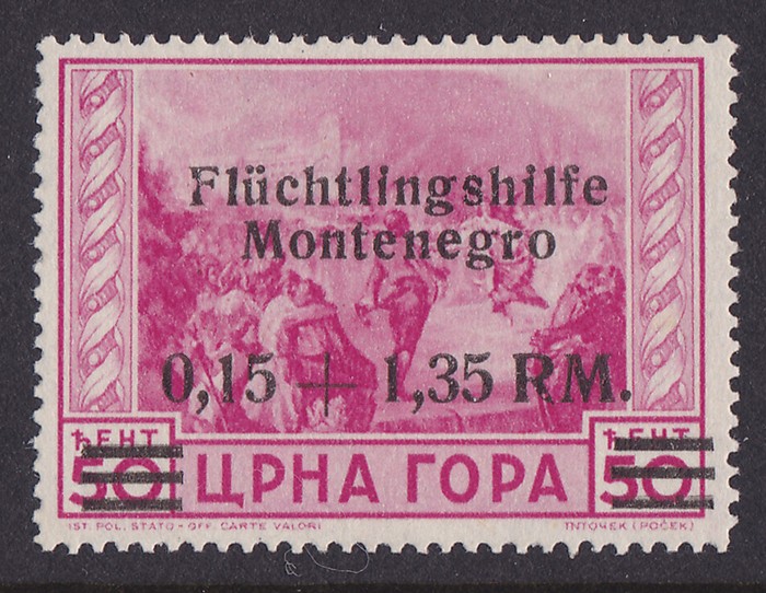Red Cross opt Pictorial 0.15+1.35RM/50c rose-magenta, variety 'g in Montenegro level instead of raised' which occurred once per sheet. Superb fresh MNH. Mi 30I cat €200, Sass 22a cat €180 for M, so €400 MNH. Only 100 of variety