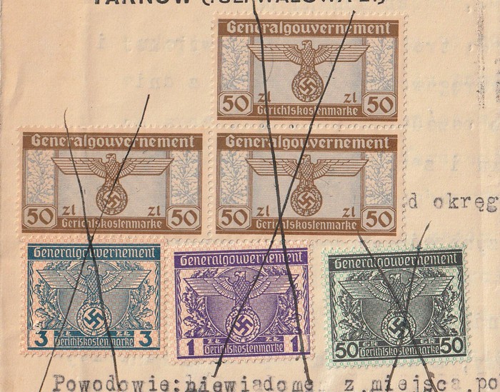 Govt: 1940-44 legal documents with various Stamp Duty & Court Fee revenues to 5zl, inc mixed frankings. Mostly F-VF. Interesting lot. (11 docs) (Image1)