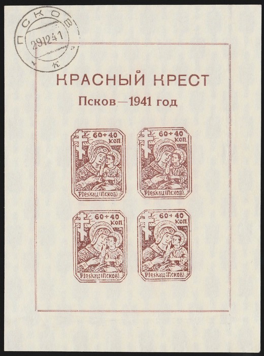 1942 Red Cross Madonna 60+40k M/Sheet with brown Cross, shifted design on rough yellowish paper no wmk, imperf. VFU, Pskov 11.3.42 cds in top left cnr as issued, with MNH gum on stamps & MLH margin, size 119x161mm. Mi Blk 2Z cat